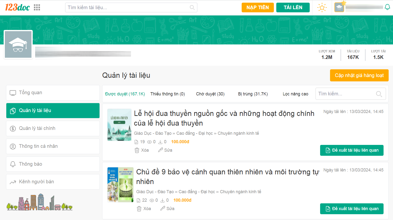 Để dễ dàng theo dõi, quản lý tài liệu được đăng tải trên 123doc, BQT cập nhật giao diện của Danh mục Quản lý tài liệu và Kênh người bán tại Trang cá nhân của người dùng.