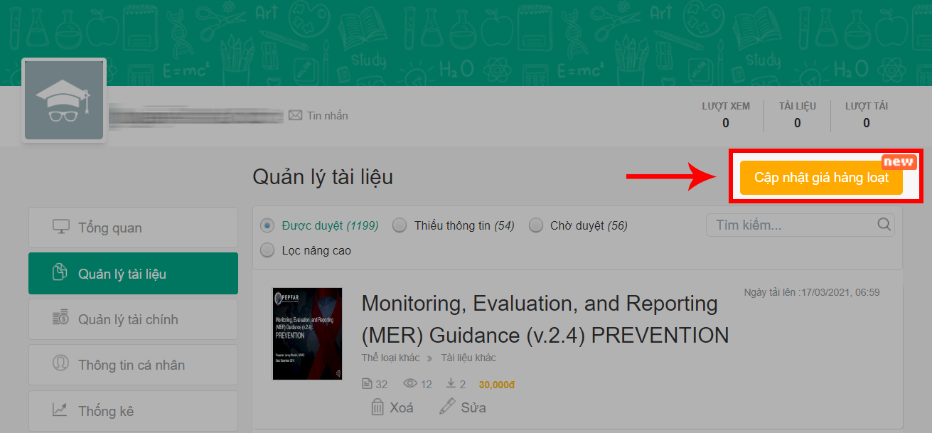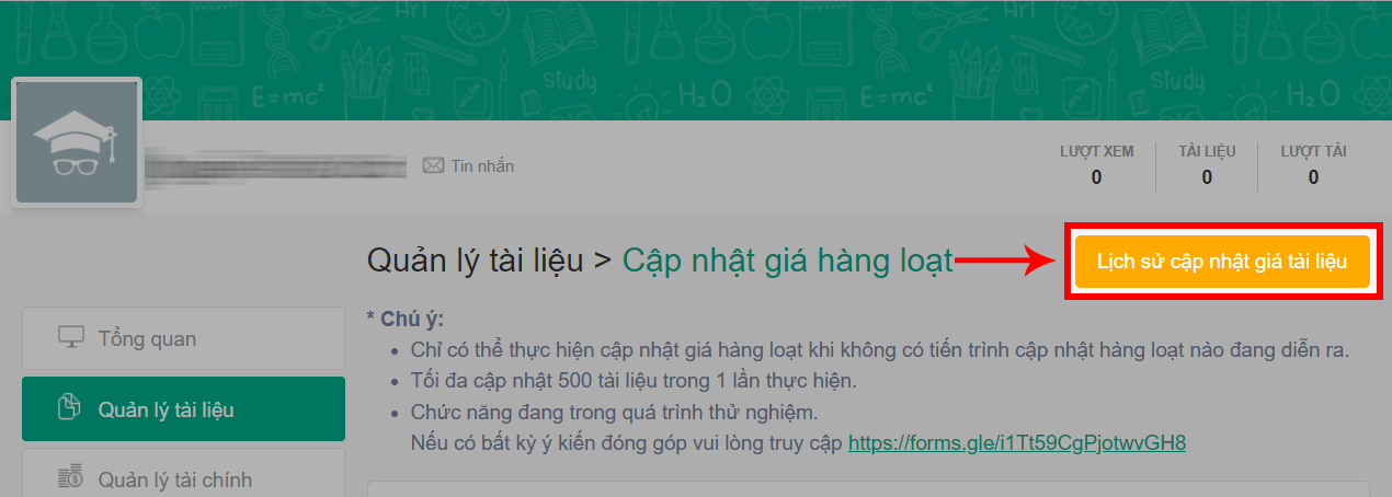 Bạn có thể xem video hướng dẫn CẬP NHẬT GIÁ TÀI LIỆU HÀNG LOẠT Bước 1: Vào mục QUẢN LÝ TÀI LIỆU của trang cá nhân Sau đó, chọn tính năng CẬP NHẬT GIÁ HÀNG LOẠT