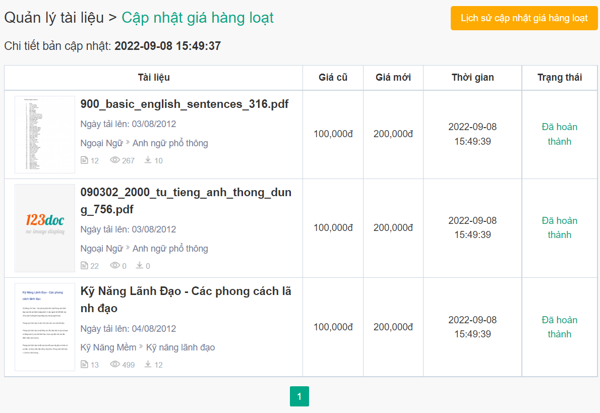 KIỂM TRA TÌNH TRẠNG VÀ LỊCH SỬ CẬP NHẬT GIÁ HÀNG LOẠT Tại danh mục Quản lý tài liệu » Cập nhật giá hàng loạt, nhấn LỊCH SỬ CẬP NHẬT GIÁ TÀI LIỆU Hệ thống hiển thị danh sách những lần cập nhật giá hàng loạt và thông tin khái quát về mỗi lần cập nhật. Để xem chi tiết thông tin các tài liệu mỗi lần cập nhật giá, bạn nhấn vào Chi tiết tương ứng.