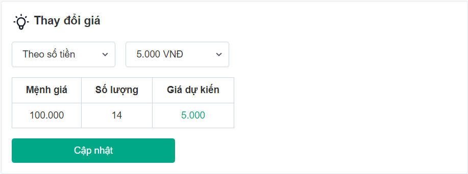 Bạn có thể lựa chọn mức giá theo các mức đã có hoặc tự đặt theo mong muốn cá nhân. • Thay đổi theo tỉ lệ